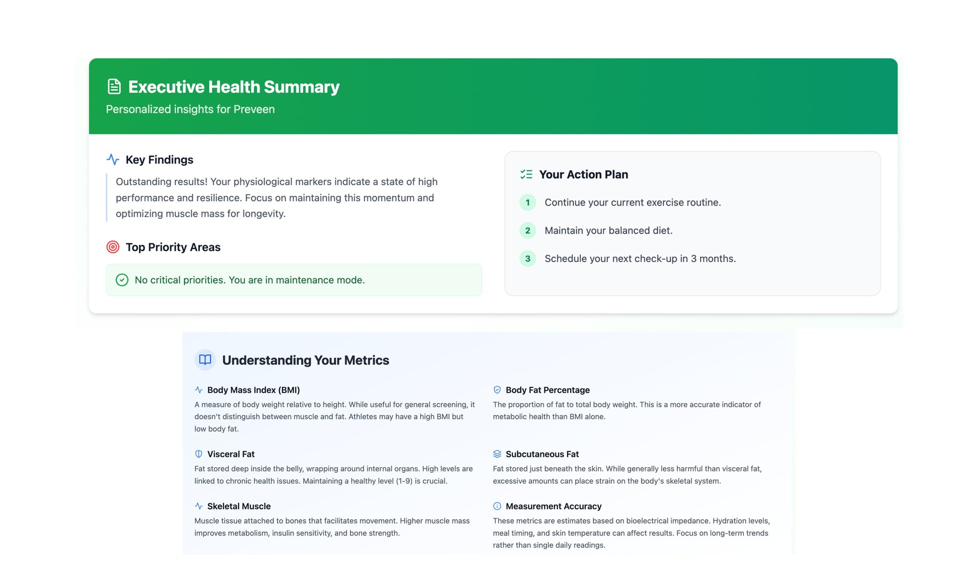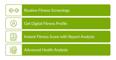 Monthly fitness screenings with advanced health insights, actions and recommendations— track, improve, and recheck your health the smart way.