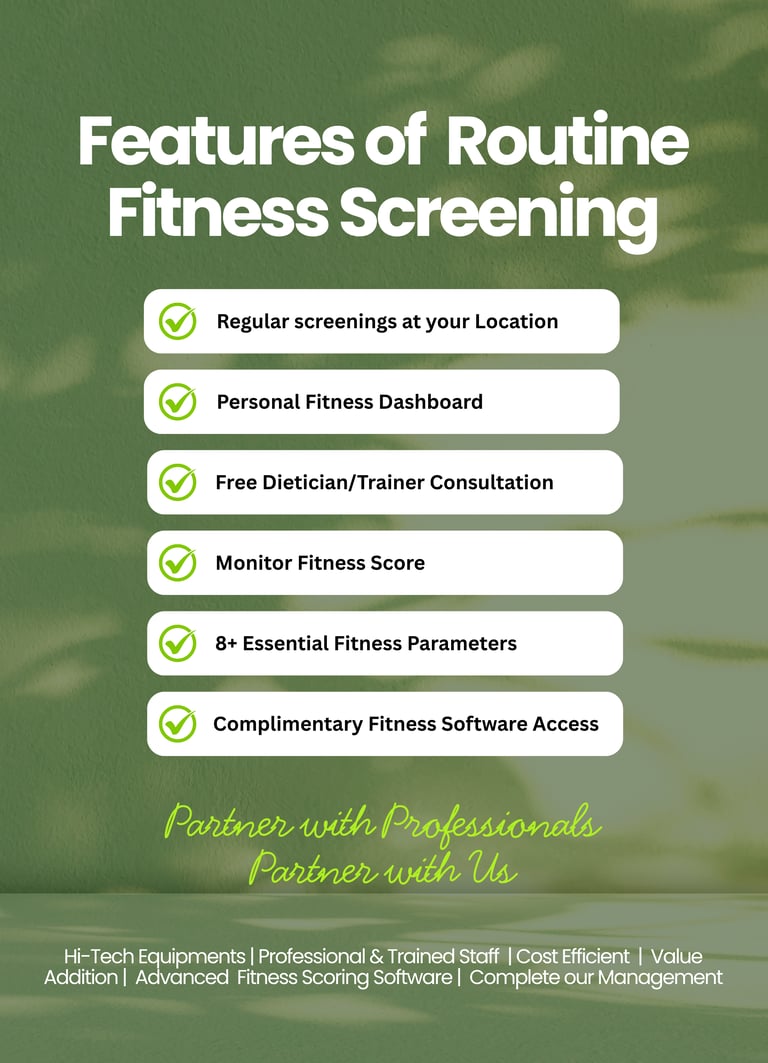 A Team of Qualified Professionals will visit your location every month to to conduct a RFS (Routine Fitness Screening) of all members and collect the data in your phiawell system for your easy access and management