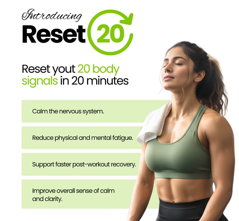 Reset 20 is a guided recovery protocol that helps your body shift from stress mode to recovery mode.