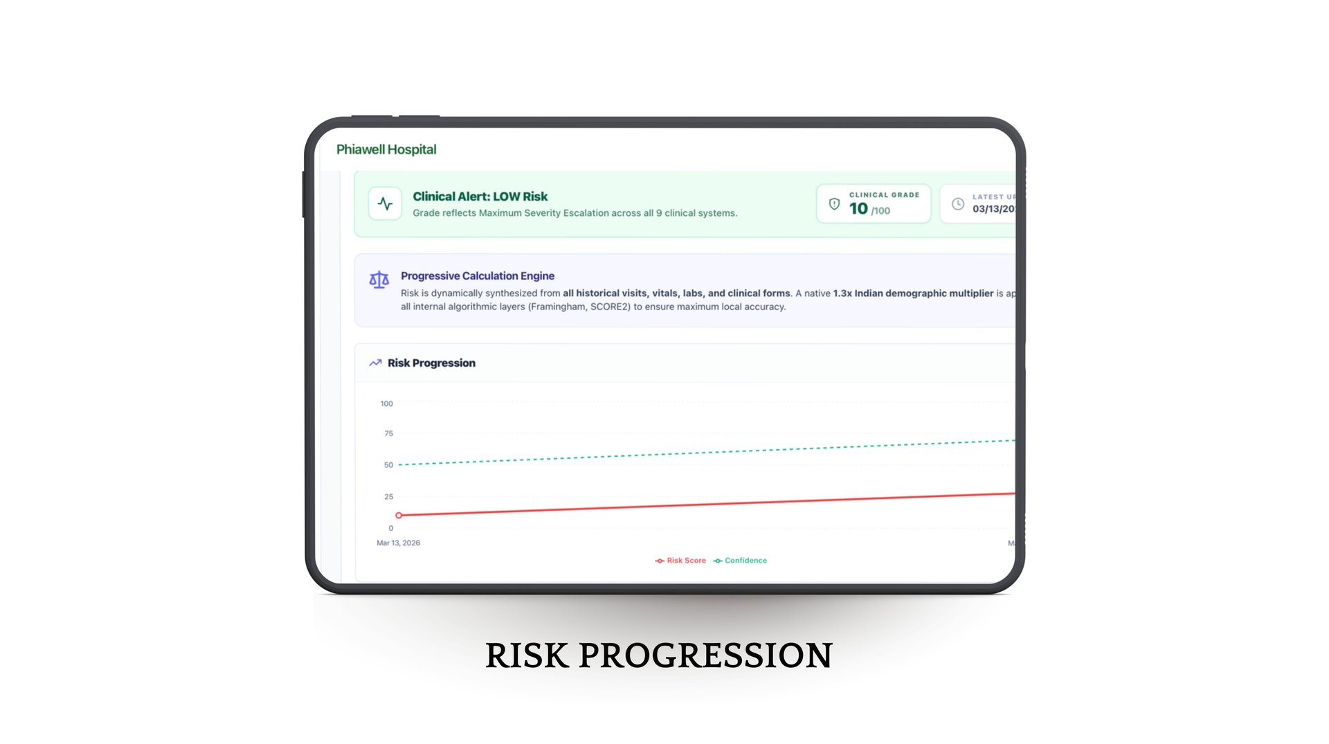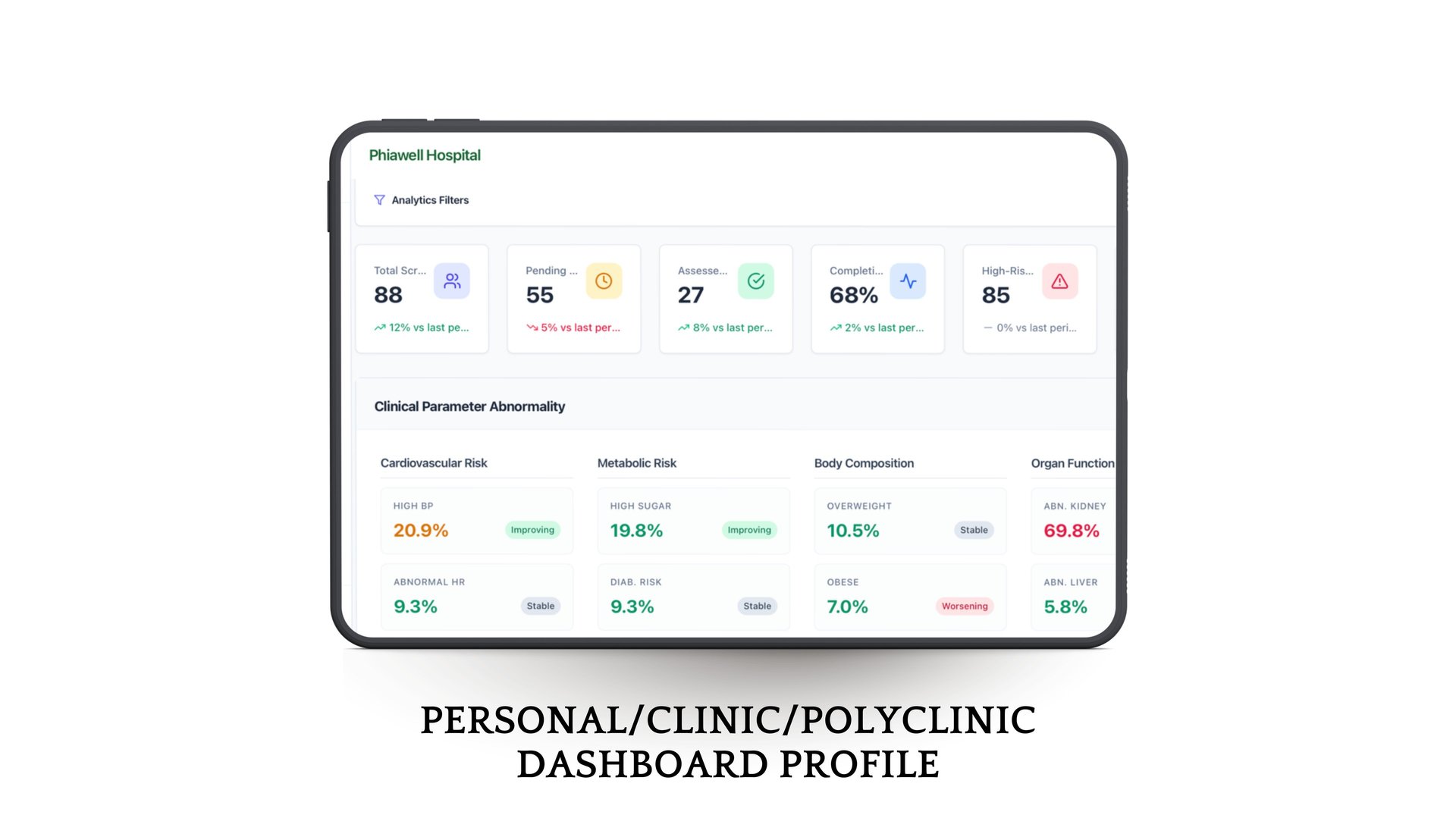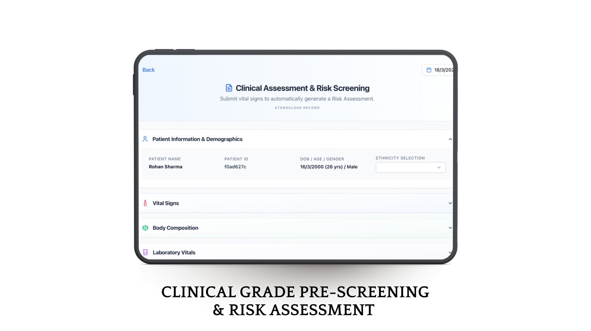 By evaluating vitals, demographics, and other screening parameters, the system creates a standardized risk profile for each patient and assigns a confidence score based on data completeness. This helps clinicians quickly understand potential health risks and support early, informed medical decisions.