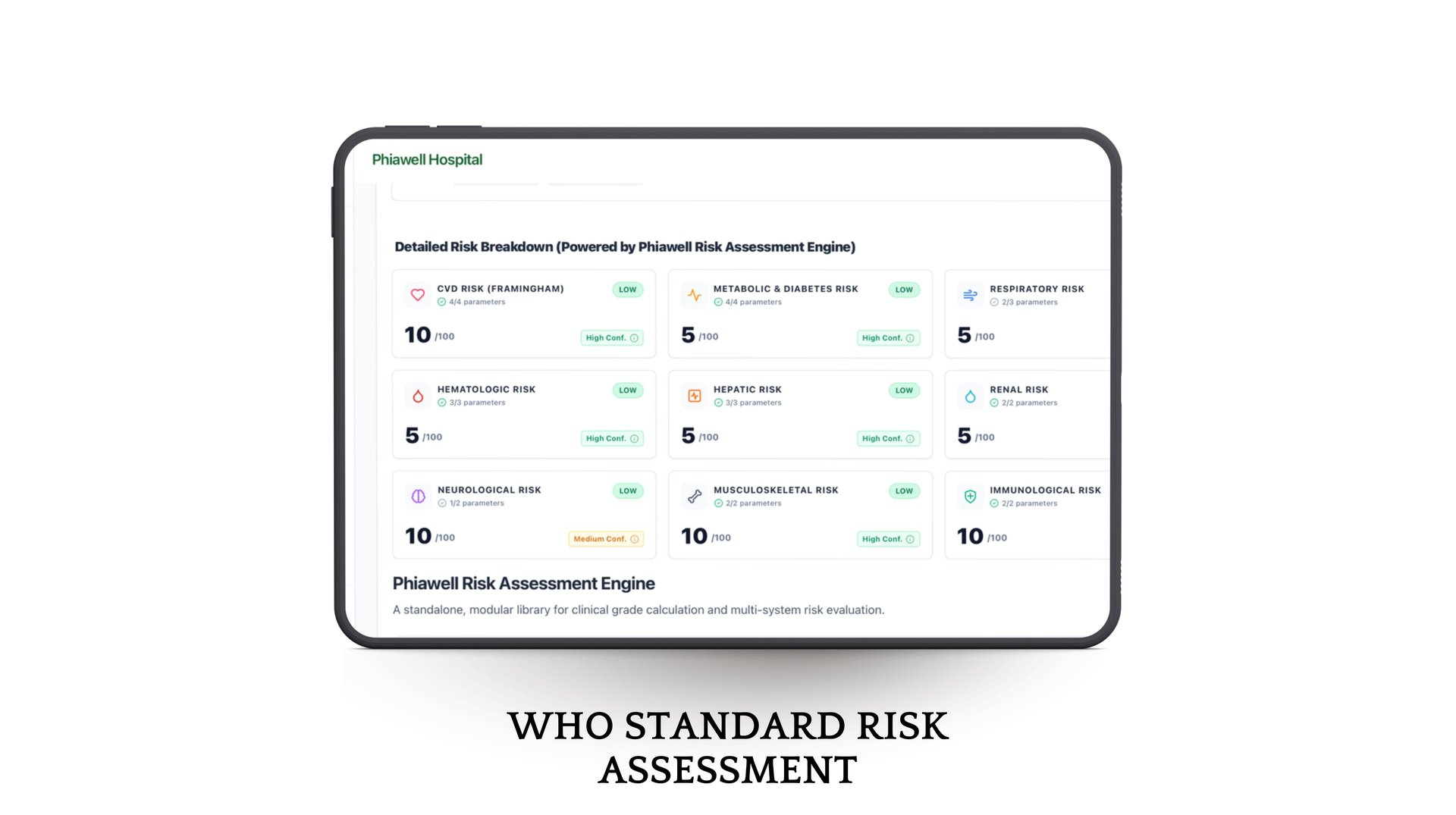Phiawell’s Risk Assessment Models use clinically recognized algorithms, including WHO-based risk evaluation frameworks, to analyze patient screening data and generate structured health risk insights.